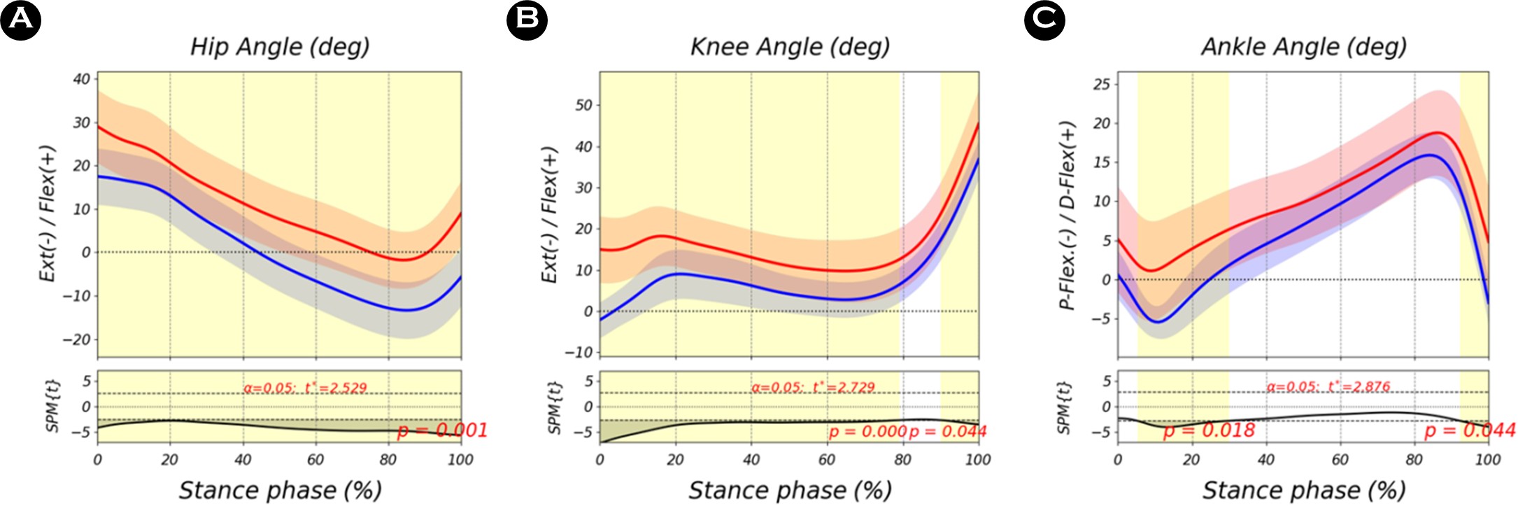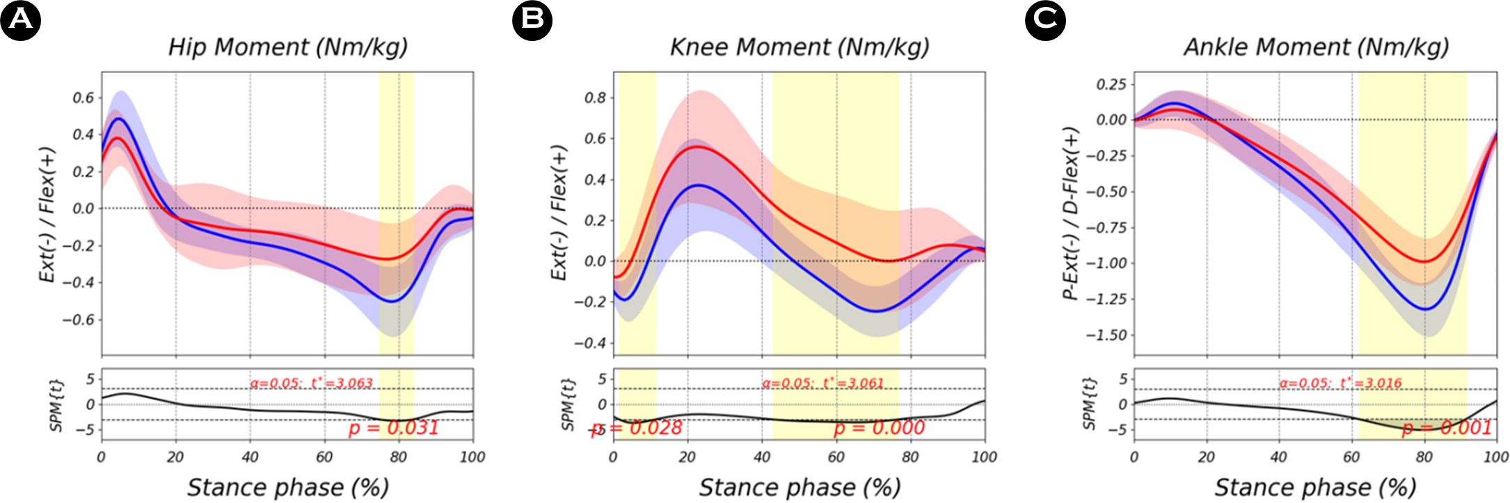 엉덩관절 각도는 입각기 전 구간(0-100%)에서 집단 간 유의한 차이를 보였다(p=.001). 무릎관절 각도의 경우, 0-79% 구간(p<.001)과 90-100% 구간(p=.044)에서 유의한 차이가 나타났다. 발목관절 각도는 5-30% 구간(p=.018)과 92-100% 구간(p=.044)에서 통계적으로 유의한 차이가 관찰되었다. 입각기 동안의 관절 모멘트에 대한 SPM 분석 결과, 엉덩관절 모멘트는 75-84% 구간에서 집단 간 통계적으로 유의한 차이가 나타났다(p=.031). 무릎관절 모멘트는 2-11% 구간(p=.028)과 43-77% 구간(p<.001)에서 유의한 차이를 보였다. 발목관절 모멘트의 경우, 62-91% 구간에서 두 집단 간 통계적으로 유의한 차이가 확인되었다(p=.001).