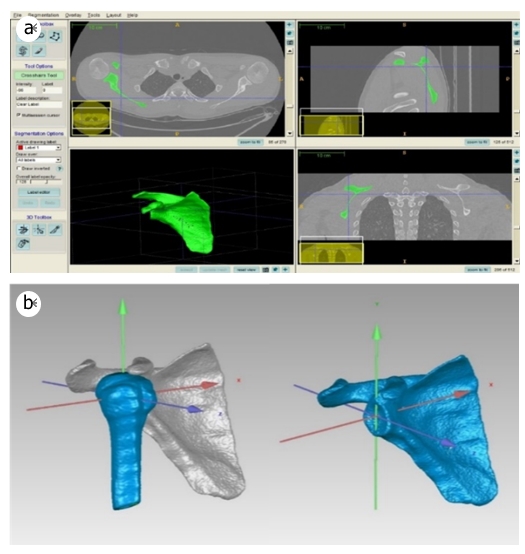 Each participant abducted their arms along the scapular plane to maximum elevation while keeping the elbow fully extended, under C-arm fluoroscopy (Zen-2090 Pro; Genoray Co., Ltd, Korea) with 16 frames per second. To calibrate barrel distortion of the radiographic projection parameters, we used calibration files by customized CT scans (GE Brightspeed S; GE Healthcare, Milwaukee, WI, USA) of the shoulder complex, which were obtained with a 0.6-mm slice pitch (image matrix, 512×512; pixel size, 0.6×0.6 mm). The CT images were segmented, and 3D models of the humerus and scapula bone were generated (ITK-Snap; Penn Image Computing and Science Laboratory, Philadelphia, PA, USA). Additionally, the bone models were trimmed using the ITK-Snap (Figure 2).