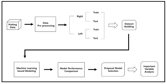 Method: Putting data were collected using an IMU sensor measuring 12 variables from 6 adult males in their 20s at K University who had no golf experience. The data was preprocessed so that it could be applied to machine learning, and a model was built using five machine learning algorithms. Finally, by comparing the performance of the built models, the model with the highest performance was selected as the proposed model, and then 12 variables of the IMU sensor were applied one by one to analyze important variables affecting the learning performance.