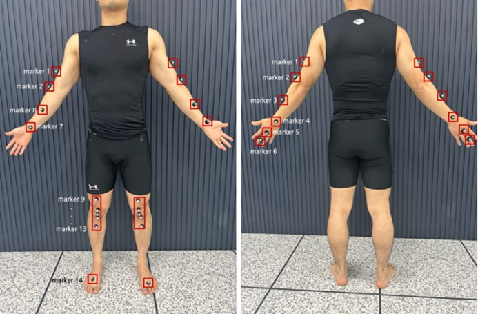 마커의 위치데이터를 획득하기 위해 8대의 광학 모션 캡처 카메라(Miqus M5; Qualisys AB, Gothenburg, Sweden; sampling rate 250 Hz)를 사용하였고, 3차원 공간 좌표화를 위해 NLT (non-linear transformation) 방식의 캘리브레이션(calibration)을 진행하였다. 이때 좌우 방향을 x 축, 전후 방향을 y 축, 수직 방향을 z 축으로 정의하였다. 반사마커는 12 mm의 크기를 사용하였으며, 부착 위치는 <Figure 1>에 표시된 28곳 중 전후 움직임이 크게 형성되는 양 측 부위에 각 5개씩 총 10개를 부착하였다(Table 3). 마커 부착 위치의 해부학적 위치는 <Table 2>와 같다. 또한 반사마커의 위치데이터는 QTM (Qualisys Track Manager; Qualisys, Gothenburg, Sweden) 프로그램을 사용하여 획득하였다.