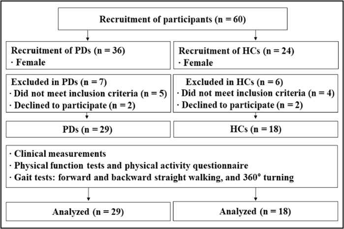 연구 대상자는 신경과 전문의에게 UK Parkinson's Disease Society Brain Bank의 기준에 따라(Hughes, Daniel & Lees, 2001) 특발성 파킨슨병을 진단받은 여성 환자 29명과 동연령대 건강한 여성 대조 그룹 18명을 모집하였다(Figure 1. 참조). 연구 대상자의 선정기준은 60-69세 여성, 스스로 보행 및 이동이 가능하고, 한국형 간이인지 기능검사(Korean Mini Mental State Examination, K-MMSE) 24점 이상(Kang, Na & Hahn, 1997)인 대상자, 수정된 Hoehn & Yahr (H&Y) 1-3단계(Goetz et al., 2004; Hoehn & Yahr, 1967; Martinez-Martin et al., 2018), 항파킨슨병 약물에 안정적으로 반응하는 환자로 선정하였다. 연구 대상자의 제외기준은 심혈관계, 근골격계, 전정기관 또는 다른 신경학적 장애 병력을 가졌거나 이동하는 동안 보조기구를 사용해야 하는 환자, 약에 의해 통제할 수 없는 운동이상증을 가진 환자로 하였다. 동연령대 여성 대조 그룹은 최근 6개월 동안 인지 장애 및 보행 장애와 관련된 병력이 있거나 정형외과적으로 수술을 받은 대상자는 제외하였다(Table 1. 참조). 이 연구는 실험과 관련된 모든 절차에 관하여 실험 전 동아대학교 의료원 임상윤리위원회(The Institutional Review Board)의 심의를 받았으며(DAUHIRB-22-089), 연구 대상자는 심의 결과에 따라 승인된 실험동의서에 대해 충분한 설명을 받은 후 서명하였다. 또한 이 연구는 한국 질병관리청 임상연구정보서비스(The Clinical Research Information Service)에 등록되어 관련 지침 및 규정을 준수하였다(KCT0009353).
