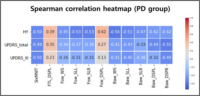 상관분석은 파킨슨병 환자 그룹 내 연속형 변수 간의 비선형 관계를 고려하여 비모수적 분석 방법인 Spearman의 순위 상관계수(Spearman's rank correlation coefficient, ρ)를 기반으로 하였다. 환자의 임상 특성과 신체활동 점수, 신체 기능, 보행 변수 간의 상호 연관성을 확인하기 위해 변수들에 대한 상관계수 및 유의확률을 계산한 후, 환자의 임상 특성과 유의한 차이가 나타난 변수들을 기반으로 상관계수 행렬을 히트맵(Heatmap)으로 시각화하였다(Figure 3. 참조).