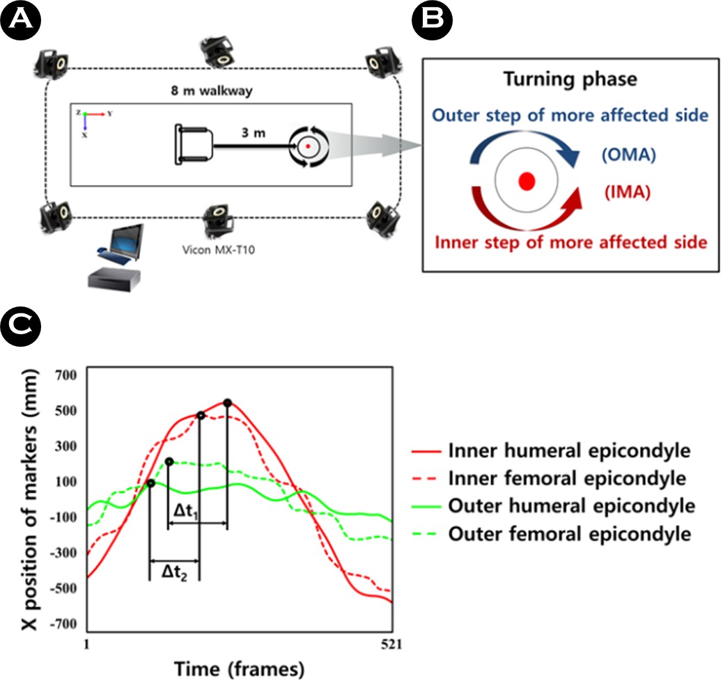 보행 측정은 자가 선호 속도(Preferred speed, PS)로 전방(Forward) 및 후방 직선 걷기(Backward straight walking), 360° 회전 과업을 실시하였으며, 모든 측정은 약 2회 정도 연습을 실시하였다. 360° 회전 과업은 일상생활에서 걷는 자가 선호 속도와 가능한 빠르게 일어서서 걷는 최대 속도(Fast speed, FS)로 환측(More-affected side, MAS)과 건측(Less-affected side, LAS) 방향 회전으로 실시하였다. 구체적으로, 회전 시 환측이 안쪽일 경우(Inner step of the more-affected side, IMA)와 바깥쪽일 경우(Outer step of the more-affected side, OMA) 두 방향으로 수행하였다(Park et al., 2021). 이러한 이유는 대부분의 파킨슨병 환자들은 증상 영향을 더 받은 환측이 안쪽으로 회전을 수행할 때 더 큰 어려움을 겪는 것으로 나타난 선행 연구 결과에 기반한 것이다(Park et al., 2021; Park, Shin, Youm & Cheon, 2024). 모든 연구 대상자들의 환측에 대한 회전 방향은 신경과 전문의에 의해 분류되었다(Figure 2. 참조). 모든 보행 과업은 각각 3회의 무작위 순서로 측정하였으며, 연구 대상자의 컨디션 조절과 피로를 예방하기 위해 1회 동작 후 약 30초의 휴식을 취하도록 하였다.