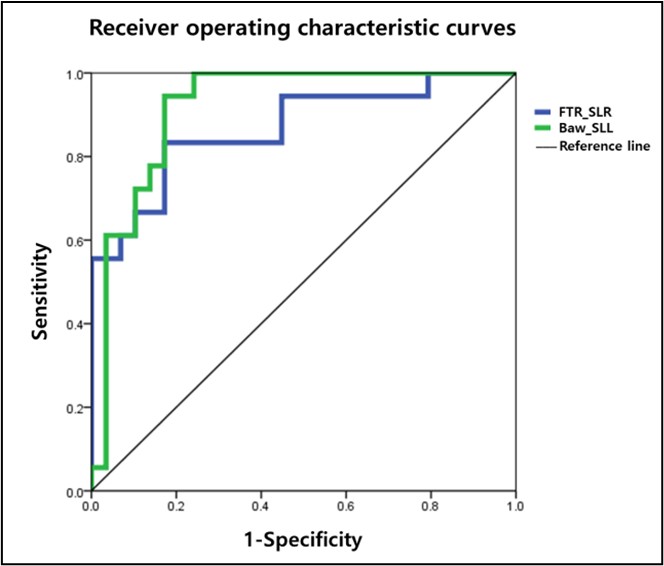 파킨슨병 환자와 대조 그룹을 가장 잘 분류할 수 있는 주요 예측 요인을 식별하기 위해 단계적 이원 로지스틱 회귀 분석을 수행하였다(Table 4. 참조). 빠른 속도 OMA 회전 시 스트라이드 길이(건측) (Cutoff value: 0.68 m, sensitivity: 0.833; specificity: 0.828, AUC: 0.868, p < .001)와 후방 걷기 시 스트라이드 길이(환측) (Cutoff value: 0.72 m, sensitivity: 0.944; specificity: 0.828, AUC: 0.920, p < .001)가 길수록 파킨슨병 환자로 분류하는 데 기여함을 나타냈다(Figure 4. 참조).