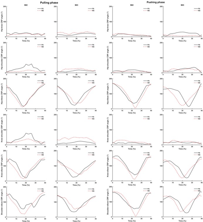Results: During pumping, the elbow joint exhibited contrasting kinematic characteristics in terms of joint angles and angular velocities compared to the hip, knee, and shoulder joints. CRP was observed in-phase coordination among between hip, knee, and shoulder joints, while anti-phase coordination was found between the elbow joint and the other joints. The FS condition showed greater hip and knee joint ROM, joint angles, and angular velocities, as well as reduced elbow joint ROM, and longer time spent during phase 2.
