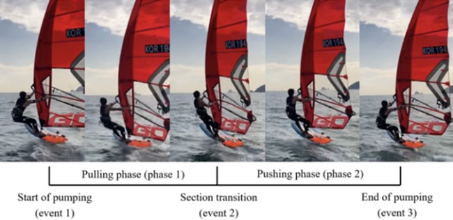 Pumping is a technique used to accelerate the board in low wind conditions (3 m/s; 4-5 knots) (So, Chan, Appel & Yuan, 2004). By repeatedly pulling and pushing the sail, athletes create drag force that generates aerodynamic lift and propul- sion, allowing the board to glide more effectively (Rodriguez, 2021; Young, Morris, Schutt & Williamson, 2019). However, studies on pumping have primarily focused on athletes' phys- ical abilities (Bojsen-Møller, Larsson & Aagaard, 2015; Hagiwara, Ohya, Yamanaka, Onuma & Suzuki, 2017; Vogiatzis, De Vito, Rodio, Madaffari & Marchetti, 2002). Investigations of pumping movements have been limited to qualitative descriptions of athletes' actions (Vogiatzis & De Vito, 2015) or quantification of joint angles and center of gravity trajectories using three-dimensional (3D) analysis via video cameras in controlled experimental settings (So et al., 2004). Considering that high-performance athletes use technically different strategies com- pared to low-performance athletes, merely imitating move- ments without understanding their underlying principles can result in wasted stamina and effort. Therefore, understanding the mechanics of the movements is crucial (Guevel, Hogrel & Marini, 2000). In addition, body movement is facilitated by the coordination of multiple joints like a connected chain. Coordination is defined as the ability to assemble and maintain a series of proper relationships between joints or segments during motion (Chiu & Chou, 2012). Therefore, improvements in movement performance are likely related to the kinematics of multiple joints rather than a single joint. Continuous re- lative phase (CRP) describes the coordination through the phase difference between two segments or joints (Hamill, van Emmerik, Heiderscheit & Li, 1999). Because it includes con- tinuous spatial and temporal information, CRP can contribute to improving individual performance and identifying optimal coordination patterns (Miller, Chang, Baird, Van Emmerik & Hamill, 2010). Pumping is described as a pushing of the sail by flexing the knees and hip joints and extending the elbows and a subsequent pulling of the sail by flexing the elbows while extending the knees and hip joints; moreover, rhythmic, and repetitive movements of the upper and lower extremities are important for efficient pumping (Castagna & Brisswalter, 2007; Vogiatzis & De Vito, 2015). Therefore, it is important to evaluate the kinematics of the hip, knee, shoulder, and elbow joints and investigate the natural movements of the upper and lower limb joints.
