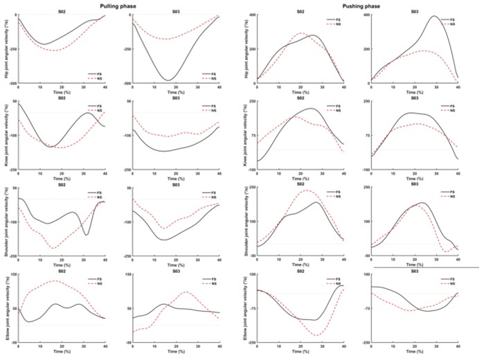The results of each participant's joint angular velocity during pumping, based on footstraps usage, are shown in Figure 3. The elbow joint angular velocities exhibit a pattern that con- trasts with all other joints. While all joint angular velocities showed similar patterns across participants, the hip angular velocity in S03 exhibited a noticeably steeper increase and decrease in the FS condition compared to the NS condition.