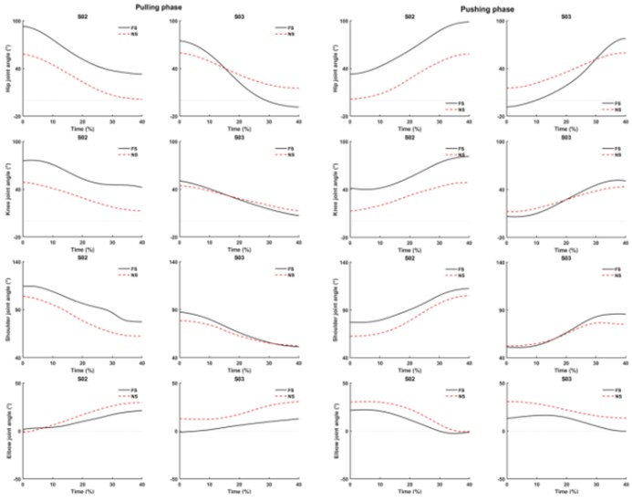 The results of each participant's ROM during pumping, based on footstraps usage, are presented in Table 3. For the shoulder joint, ROM showed contrasting patterns among participants between the FS and NS conditions. In contrast, ROM in the hip and knee joints tended to increase in the FS condition compared to the NS condition, consistently across participants. Similarly, ROM in the elbow joint tended to decrease in the FS condition compared to the NS condition, also showing consistent patterns across participants.