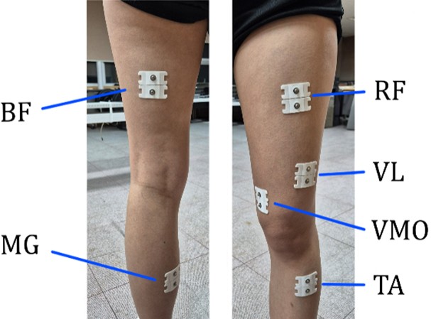 하지 근육의 근활성도 측정을 위해 Ultium Electromyo- graphy (EMG) 시스템(Noraxon, Scottsdale, AZ, USA)을 사용하였다. EMG 전극을 부착한 후에는 장비 적응을 위해 준비 운동과 카약 에르고미터(Dansprint PRO Kayak Ergometer) 세팅 시간을 제공하였다. 에르고미터는 실제 훈련 환경과 유사하게 시트와 발판 거리, 패들 그립 너비를 대상자가 평소 사용하는 방식대로 조정하였다.