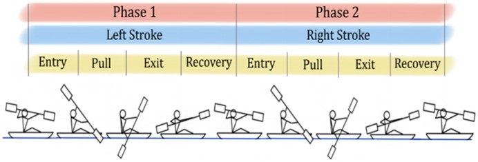 본 연구에서는 스트로크 동작에서 하지 근육의 역할을 명확히 분석하기 위해 전체 패들링 동작을 왼쪽 스트로크(Phase 1)와 오른쪽 스트로크(Phase 2)로 구분하였다(Figure 2). 각 Phase는 패들의 블레이드가 물속에 들어가는 입수(Entry), 물에 잠긴 블레이드를 몸쪽으로 끌어오는 당기기(Pull), 블레이드를 수면 밖으로 빼는 출수(Exit), 물 밖에서 반대쪽 입수 자세를 준비하는 회복(Recovery)의 네 단계로 구성된다(Liu, Wang, Qiu, Zhang & Hao, 2021). 본 연구에서는 Entry와 Recovery로 이벤트 구간을 식별하였다.