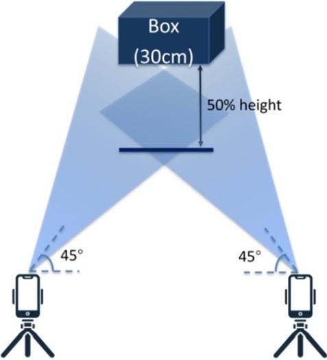 The jump landing task was based on the methodology out- lined by Padua et al. (Padua et al., 2009). Participants jumped from a 30 cm high box, landing on both feet at a target set at 50% of each participant’s height from the box. Following the setup described in Uhlrich et al. (Uhlrich et al., 2023), two iOS devices were mounted on tripods at a height of 1.2 meters and positioned around the participants (Figure 1). Three-dimensional kinematic data were collected using the cloud-based OpenCap platform.