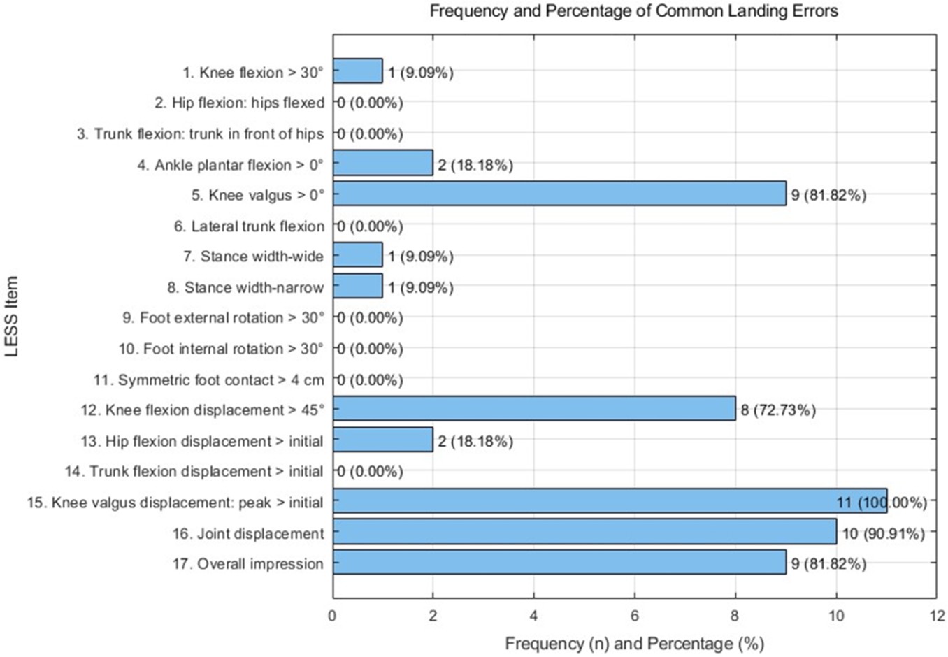 Frequency and percentage of common landing errors are shown in Figure 3. The most frequent landing error was LESS item 15 (knee valgus displacement), observed in all partici- pants (100%). LESS item 16 (joint displacement) occurred in 10 participants (90.91%), and LESS item 17 (overall impression indicating poor to average landing mechanics) appeared in 9 participants (81.82%). LESS item 5 (knee valgus at initial contact) was noted in 9 participants (81.82%).