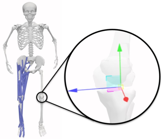 Video recordings from the two iOS devices were uploaded and processed in OpenCap to estimate joint kinematics using a full-body musculoskeletal model (Lai, Arnold & Wakeling, 2017; Rajagopal et al., 2016). Following data collection, Open- Cap files for each LESS trial were downloaded for subsequent offline analysis. The offline analysis involved two primary pro- cedures. Initially, the musculoskeletal model's knee joint was modified by adding two additional degrees of freedom. This modification enabled a more precise representation of knee joint motion in the frontal and transverse planes, which is particularly important for LESS scoring (Figure 2). Second, joint angles from the recorded LESS trials were calculated using OpenSim's inverse kinematics tool.