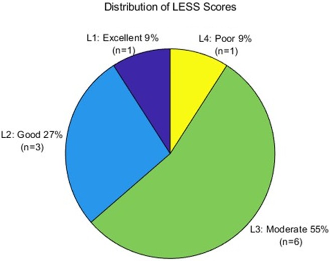 Participants were classified into four categories based on their LESS scores: excellent (≤4), good (>4 to ≤5), moderate (>5 to ≤6), and poor (>6) (Padua et al., 2009). The distribution was as follows: moderate (55%, n = 6), good (27%, n = 3), excellent (9%, n = 1), and poor (9%, n = 1) (Figure 4).