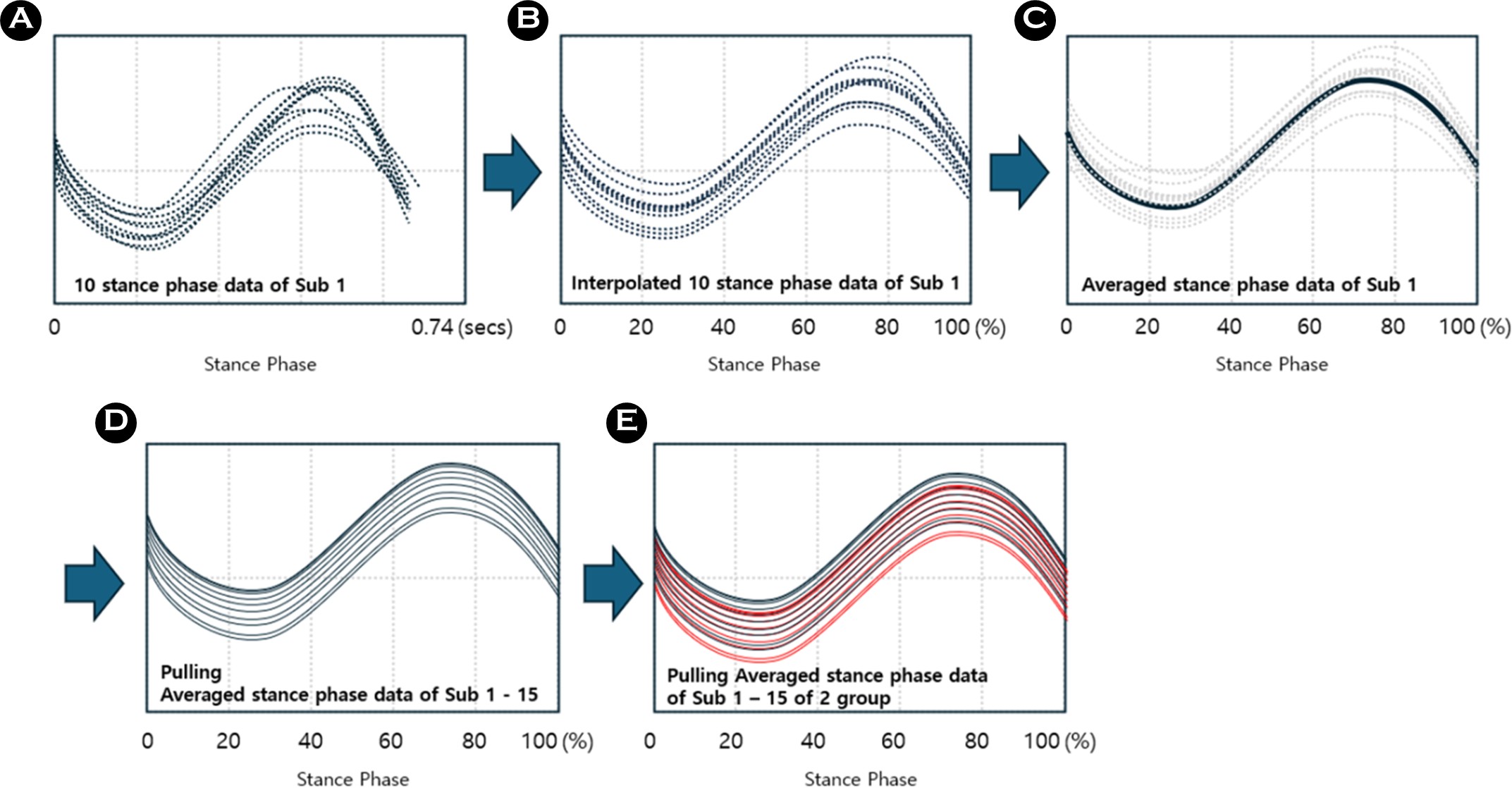 본 연구에서 산출된 각 변인의 데이터 처리 흐름은 다음과 같다(Figure 2). 동일한 보행 속도 하에서도 매 걸음마다 미세하게 나타나는 보행 변동성(Gait variability)으로 인해 각 입각기 원시 데이터는 서로 다른 데이터 길이(Data length)를 가졌다(Figure 2A). 이러한 각기 다른 길이의 데이터를 동일한 위상에서 비교하기 위해, 선형 보간법(Linear interpolation)을 적용하여 모든 입각기 구간을 101개(0-100%)의 데이터로 정규화하였다(Figure 2B). 정규화된 10개의 입각기 데이터는 하나의 파형으로 평균화하였으며(Figure 2C), 통계적 비교를 위해 해당 그룹 내 모든 피험자의 평균 파형 데이터를 결합하였다(Figure 2D). 비교 대상 그룹에 대해서도 동일한 절차를 반복하여 통계 분석을 위한 최종 데이터 셋을 구축하였다(Figure 2E).
