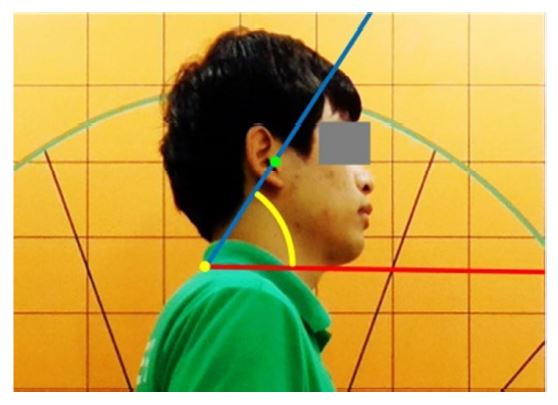 In the subject's standing posture, the head maintains a natural head posture (NHP) through a self-balance posture (SBP), and the subject comfortably rests both arms on the side of the body. As shown in (Figure 1), the angle between the line connecting the 7th cervical vertebrae with the tragus of the ear and the line parallel to the floor (Chae, 2002) are used to measure the CVA.