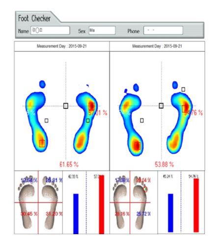 The plantar pressure was measured using a plantar pressure gauge (GHF-550, GHi Well, Korea). It is a tool that measures foot balance (Figure 3), and the measurement is taken and analyzed by having subjects stand on the foot pressure sensor. The foot balance should be located in the center in order to have the standard measurement of 50:50. The measurement items and methods are shown in (Table 2) and (Figure 4).